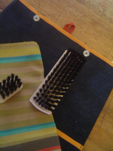 Intérieur 4 poches , fournit avec deux brosses , et un chiffon rayé . Peut s'emporter facilement en voyage , se ferme par deux pressions , et s'accroche au mur grâce à la petite patte du haut ...